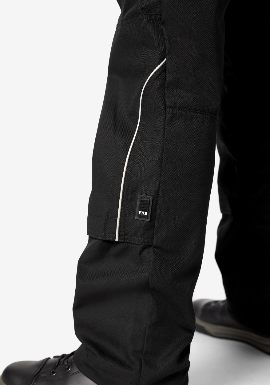 On retrouve également des poches perforées pour grenouillères FHB ainsi que des brides de contraste blanche sur les renforts de poches. Le pantalon Bruno dispose de bandes réfléchissantes pour plus de sécurité.